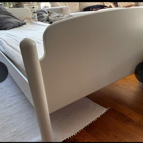 IKEA yhden hengen lastensänky 160x70cm. Runkomateriaali on puu luonnonvärisenä ja pohjana on puiset sälepohjat. Sängyssä on toisella sivulla irrotettava turvalaita, joka auttaa estämään putoamista nukkuessa. Sopii lapselle tai nuorelle yhden hengen patjalle (patjan saa mukaan halutessa)