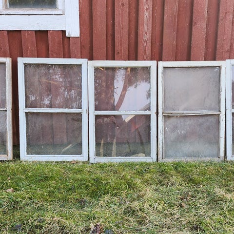 Puinen ikkunanpoka, jossa lasi ja ruutujaollinen koristelistus. 100x60cm. Koristeeksi tai puutarhaan.