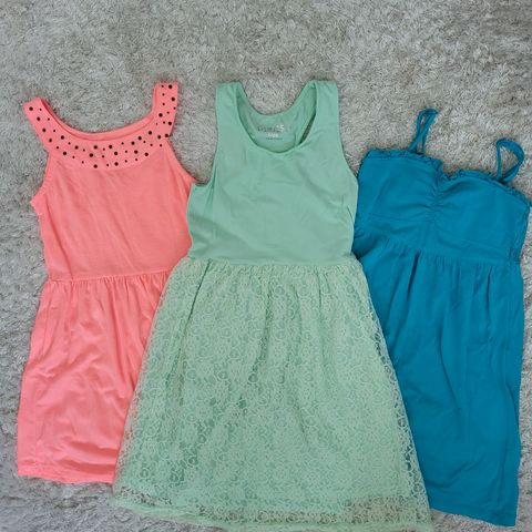 Sinisävyiset taskulliset mekot yksisarvinen 128cm ja toinen 134cm tässä pieni tahra helmassa, joka ei lähtenyt pesussa. Lemmikkieläimetön koti.