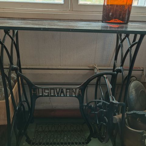 Singer pöytä, jossa musta metallirunko ja lasikansi. Runko on valmistettu vanhan Singer-ompelukoneen jalustasta, jossa on koristeelliset metalliosat ja poljinosa. Pöydän kansi on kirkasta lasia ja muodoltaan kaareva. Sopii käytettäväksi esimerkiksi sivupöytänä, konsolipöytänä tai pienenä työpöytänä sisätiloissa.