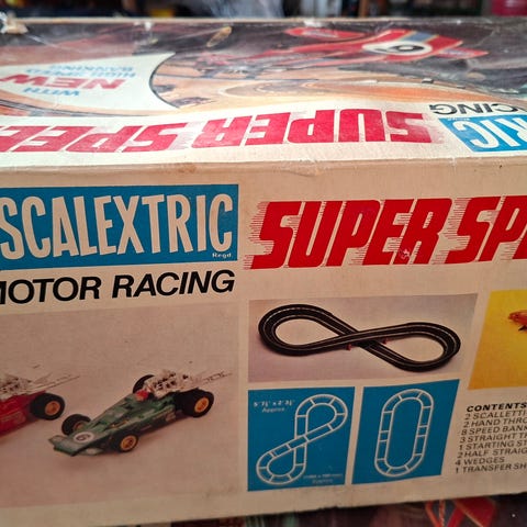 Goldfinger ja Casino Royale Aston martinit. Käyttö/kasausohje puuttuu. Rata testattu että toimii. Autojen kontaktipinnat kuluneet mutta mukana on neljä käyttämätöntä. Vanhemmasta autosta puuttuu keulamaski ja toinen valo.