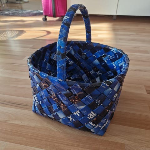 Kahvipusseista punottu kori, jossa on kantokahvat.