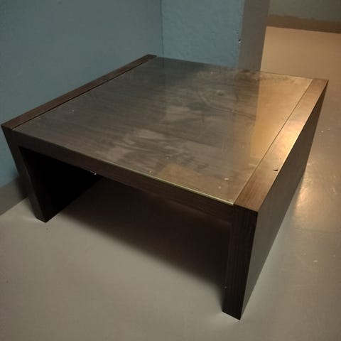 Valkoinen metallinen neliönmallinen pöytä. Ollut käytössä sohvapöytänä sekä sisällä että lasitetulla parvekkeella. Käytönjälkiä, mutta käyttökelpoinen ja ehjä. Nouto Rokkalasta.