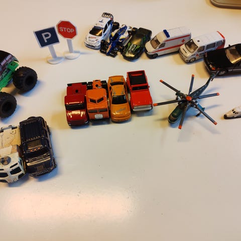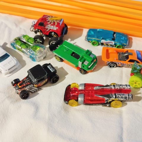 Sekava kasa pikkuautoja, nämä juuri pesty. Kaikki ehjiä seuraavaa leikkijää varten.