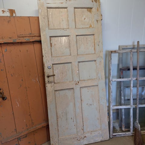 Vanha peiliovi, josta hiekkapuhallettu maalit pois. Pinta karhea, vaatii hionnan. Koko 84x200