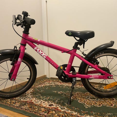Frog 48 lastenpyörä, 16" renkailla. Pyörässä on punainen runko, suora ohjaustanko käsijarruilla, lokasuojat sekä seisontatuki. Sopii lapselle, jolle 16 tuuman rengaskoko on ajankohtainen, esimerkiksi ensimmäiseksi polkupyöräksi apupyörien jälkeen tai kaupunki- ja pihapyöräilyyn. Lisävarusteina etuheijastin, soittokello sekä juomapulloteline. Tehty kevät huolto ja testattu toiminta.