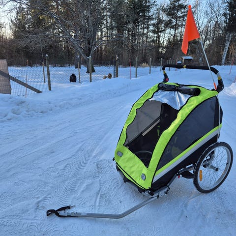Mukana varustepaketti, jolla kärry muuntuu sekä pyöräkärryksi että hiihtopulkaksi.