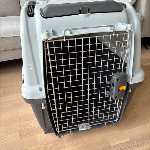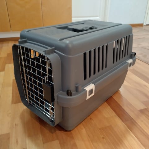 Valkoinen matkalaukku, jonka sisäosa on vaalean ja beigen sävyisellä ruutukuosilla verhoiltu. Esim. lemmikin peti. 60X35X16cm.