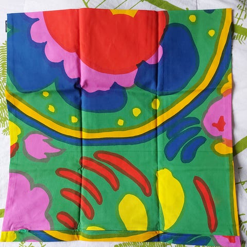 Marimekon Karkuteillä kuosin tyynynpäällinen, koko 50x50, 2 kpl. Vetoketjusuljenta, alkuperäistä Marimekon tuotantoa, ei itse tehdyt.
