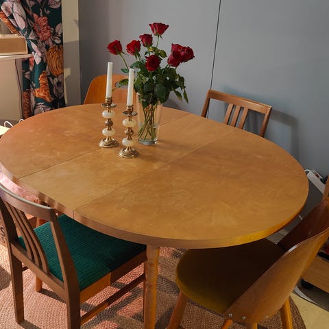 Myydään tarpeettomana vanha entisöity pyöreä pöytä.
