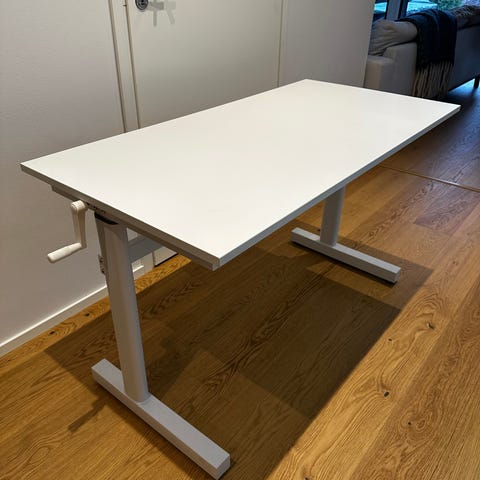 SV: Säljer ett praktiskt höj- och sänkbart skrivbord på grund av flytt. Skrivbordet har en målad bordsskiva i hårdträ och justerbara metallben.