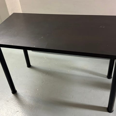 FI: Myydään muuton vuoksi näppärä korkeussäädettävä työpöytä. Pöydässä on maalattu kovapuukansi ja säädettävät metallijalat.