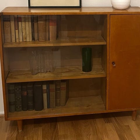 Puinen vanha, mutta hyvin pidetty ja erittäin siistikuntoinen vitriini/hylly.
