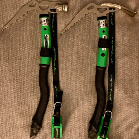 Jäähakkupari, jäähakut noin 50 cm pitkät. DMM, yksi vasarapäällä toinen kaapimella. Nähneet elämää, mutta toimivat. Black Diamondin hihnat, joita voi säätää. Sopii hyvin jäätikölle, alppikiipeilyyn ja laskuhommiin. Painavat riittävästi. Hinta kahdesta 75e