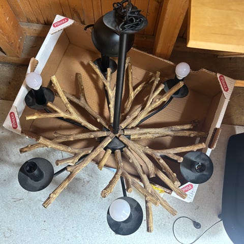 Myydään kattokruunu 12-valopaikalla. Täysin toimiva, me olemme pitäneet vain 6 lamppua. Todella valaiseva, jos kaikki 12 lamppua paikoillaan.
