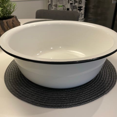 Valkoinen emalivati, mustalla reunuksella. Halkaisija 36 cm, syvyys 12 cm. Sisäpuolella ja ulkopuolella pohjassa muutamia kohtia, joissa emali rikkoutunut, näistä erilliset kuvat. Valmistaja Vähämäki, kulunut leima pohjassa. Ollut 70-luvulla äitiyspakkauksessa.