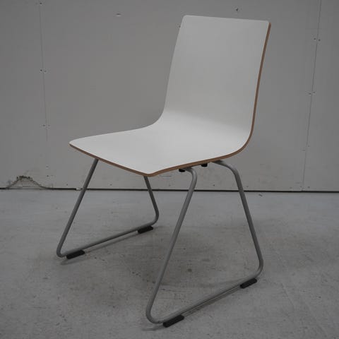 Laadukas Iskun Rudolf-tuoli. Valkoinen laminaatti, valkoinen lenkkijalka kumisilla nastoilla.
