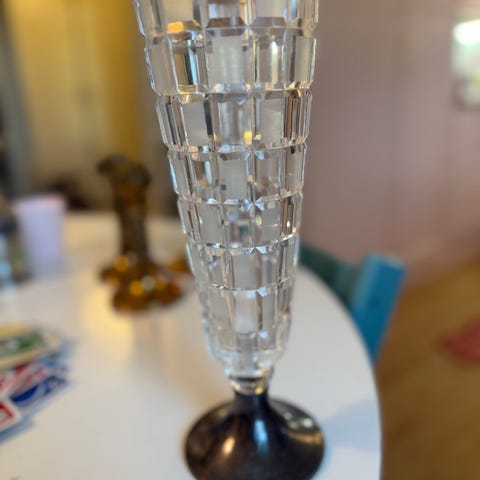 Aimo Okkolin Ruutu kristallimaljakko hopeajalalla. Korkeus 28cm. Suun halkaisija 9,5 cm. Jalustassa kaiverrus A.R. Virheetön. Katso myös muut myynnissä olevat tavarani.