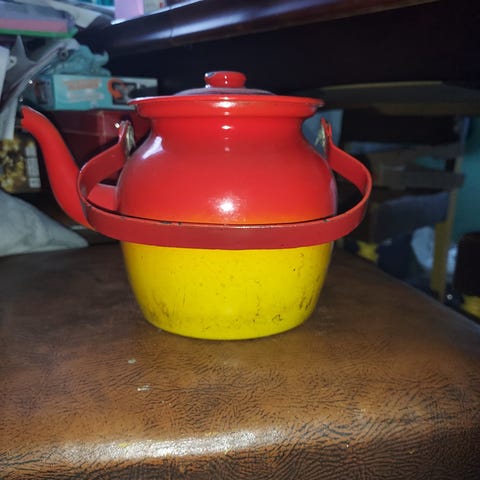Käytetty Finel Pikku pehtoori emalipannu punaisella värillä ja mustalla kahvalla. Nouto Viinikasta.