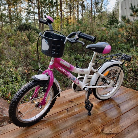 Lapselle pieneksi jäänyt, hyvin palvellut 16-tuumainen pyörä seuraavalle tarvitsijalle. Pyörän mukana etukori ja käyttämättömät apupyörät. Etujarru "deaktivoitu" meidän lapselle tarpeettomana.