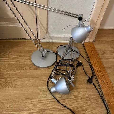 Kaksi samaan sarjaan kuuluvaa valaisinta. Pienemmän voi laittaa vaikka lipaston päälle. Myydään myös erikseen. Hyvässä kunnossa muuten, mutta pienemmässä pientä värimuutosta varjostimen reunassa.