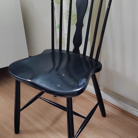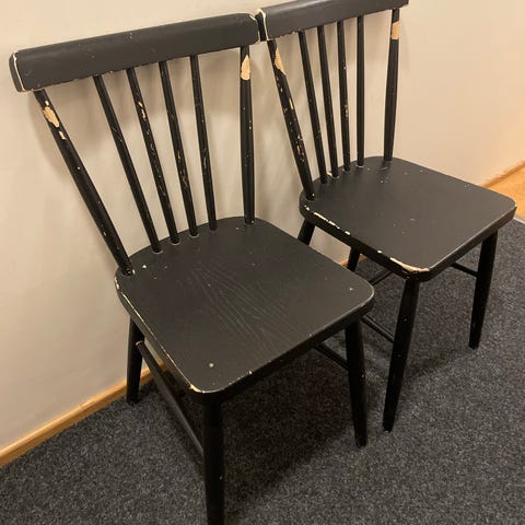 Neljä valkoista, puista pinnatuolia. Selkäosia liimailtu uudelleen jokaisesta tuolista. Istuinosia ei ole tarvinnut liimailla näistä mistään. Maalipinnoissa jälkiä (kuvissa näkyvillä). Eläintalous. Olleet sisätiloissa käytössä koko ajan. Istuinosan korkeus 45 cm. Ei myydä yksittäin. Yhteishinta 50 euroa. Vain nouto.