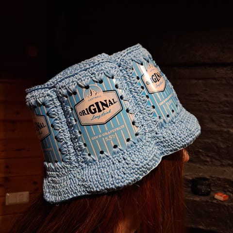 Vaaleanpunainen tölkkihattu kesän juhliin. Sopii noin 56-60cm päähän.