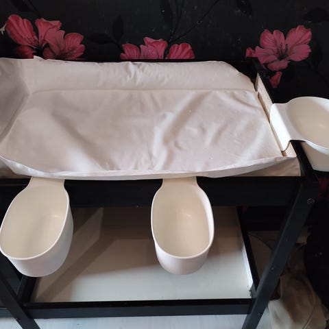 Ikean siisti hoitopöytä ja beigen värinen hoitoalusta. Alustassa pieni värjäymä pilkku, hoitopöydän tasossa pientä jälkeä mutta ne jää alustan alle.