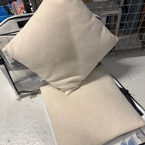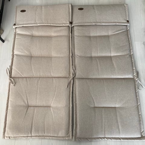 Beigejä tuolipehmusteita x4. Pehmusteissa on sidontanauhat, joilla ne saa tukevasti kiinni tuoliin.