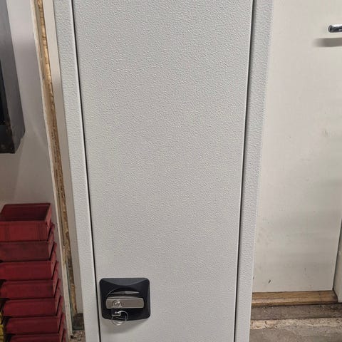 Kaappiin on kahdet avaimet, takaseinässä pidikkeet aseiden tukevaan säilytykseen. Oven sisäpuolella on metalliset hyllyt/taskut pientarvikkeille.