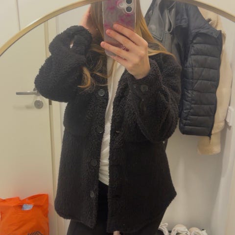 Ihanapörrö takki, Mahdollista myös käyttää toisin päin. Molemmin puolin taskut.. Toinen puoli tuommoinen pörrökuosi, mustalla karvalla ja sinisellä poikkiraidalla. Toinen liukaspintainen.