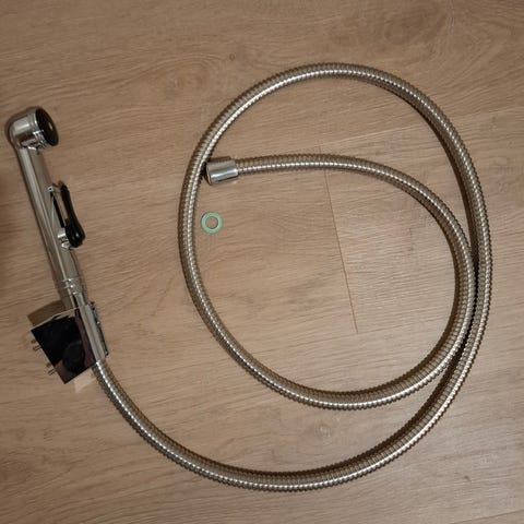 Uusi, paketissa oleva mattamusta seinään upotettava bideehana. Jäi rakennusvaiheessa tarpeettomaksi.