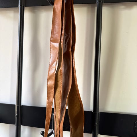 Nauhamainen nahkainen vyö, jonka päitä koristavat tupsut. Vyö on säädettävä ja sen voi solmia halutulla tavalla vyötärölle tai lantiolle. Materiaalina keinonahka. Pituus noin 2m. Uudenveroisessa kunnossa. Taloudessa ei lemmikkejä / tupakointia.