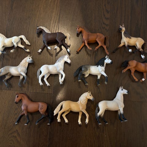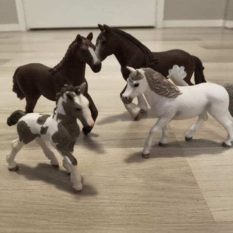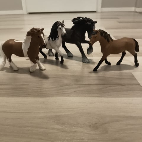 Schleich hevoshahmot lelufiguurit. Myynnissä useita erivärisiä hevoshahmoja, joilla on varusteina satuloita, suitsia, riimuja ja loimia. Hahmot ovat muovisia ja tarkoitettu lasten leikkeihin ja kokoelmiin. Soveltuvat esimerkiksi maatila- ja ratsastusleikkeihin sekä osaksi Schleich-hevostalleja ja muita Schleich-leikkisettejä.