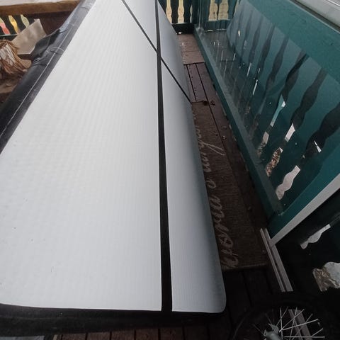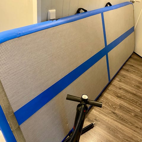 Kerran käytetty kolme metrinen Airtrack patja, jossa kätevä säilytyslaukku ja moottori.