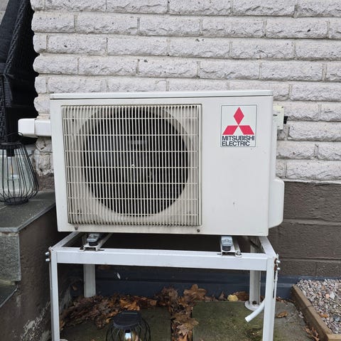 Mitsubishi Electric ilmalämpöpumppu, johon sisältyy ulkoyksikkö ja seinälle asennettava sisäyksikkö. Ulkoyksikkö on asennettu metalliselle telineelle, joka kuuluu kokonaisuuteen. Laitteen kotelointi on valkoinen. Ilmalämpöpumppu soveltuu tilojen lämmitykseen ja viilennykseen. Tarkemmat tekniset tiedot, kuten teho- ja kulutusarvot, löytyvät laitteen tyyppikilvestä kuvissa. Pumppu on toimivana purettu irti ja on heti noudettavissa. 2016 vuosimalli