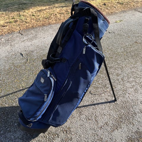 Golf kantobägi, mikä sisältää useita taskuja ja jakajia tavaroiden ja mailojen säilytykseen. Kunto oikein hyvä vielä.
