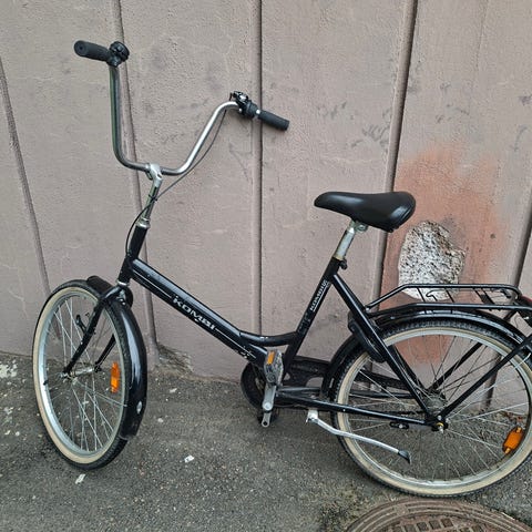 Kombin kaupunkipyörä 45 cm-kokoisella rungolla ja 24" renkailla. Unisex-mallinen pyörä, jossa matala runko helpottaa kyytiin nousua. Violetti runko, musta satula ja musta ohjaustanko. Pyörässä on takatavarateline ja lokasuojat. Soveltuu kaupunki- ja arkiajoon eri käyttäjille kokoluokan puitteissa. Pyörässä on valmiina lukko ja myös siihen avaimet. Renkaiden ilma on lähtenyt, mutta muuten on kaikki kunnossa.