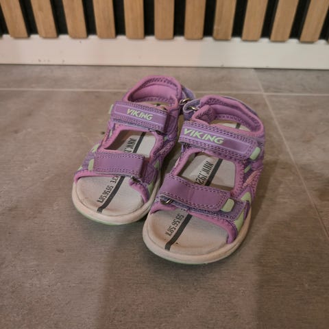 Viking lasten sandaalit, koko 24. Muuten hyvässä kunnossa, mutta yhdessä tarrassa pieni katkeama tikkauksessa (näkyy kuvissa).