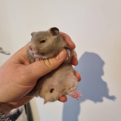 Erittäin hyvin kesytty, tottunut käsittelyyn ja sylissä oloon. Hyväntuulinen ja seurassa viihtyvä. Hamsteri noin 3 kk ikäinen.