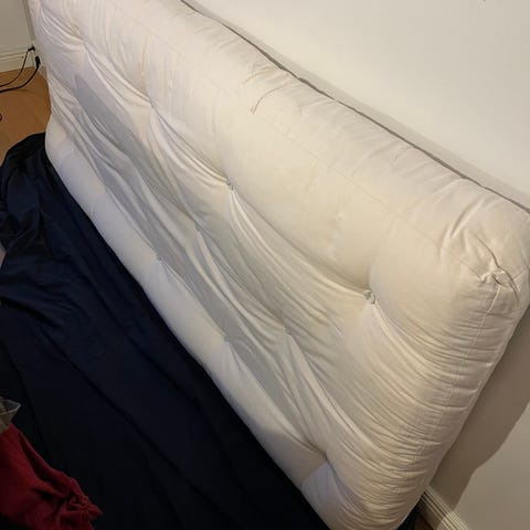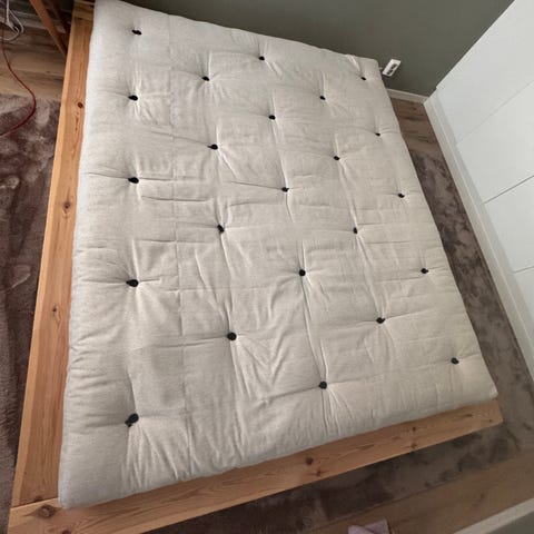 Myydään iso ja tukeva futon-patja (180 × 200 cm). Patja on painava ja jämäkkä, joten se tarjoaa hyvän tuen nukkumiseen.