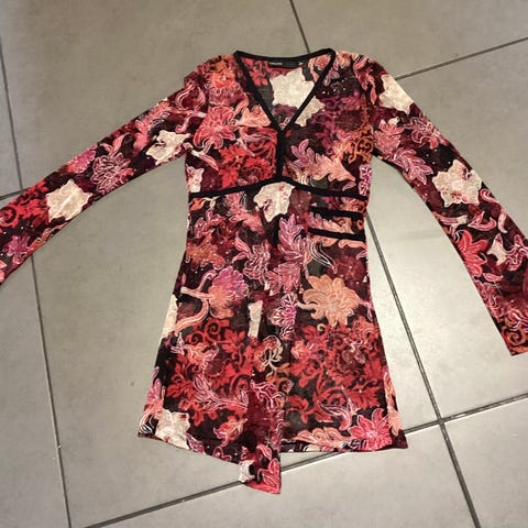 Polan ohut, joustava tunika, koko 36/38. Miellyttävän pehmeä materiaali. Taskut molemmilla puolilla, nauha vyötäröllä, hihansuissa kuminauhat.