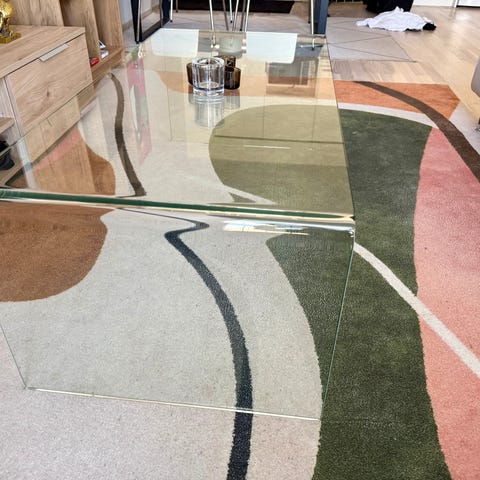 Iskusta lasinen sohvapöytä, 14mm paksu lasi ja metalli jalat.