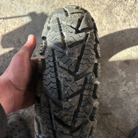 Tästä kuvan 3.50-8 nastarengas, nastoja puuttuu. Pintaa ok jäljellä.