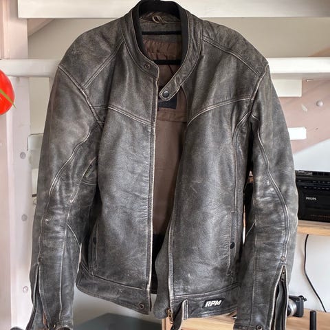 Nahkainen hyväkuntoinen ajotakki selkä ja kyynärsuojilla.