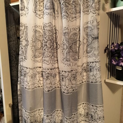 Verhot lehtikuviolla. Vaalea, lähes valkoinen kangas, jossa hillitty lehtikuvio kauttaaltaan. Sopii käytettäväksi ikkunaverhona tai huoneen jakajana. Materiaali kevyttä ja läpikuultavaa.