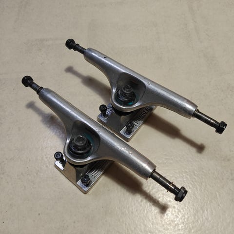Melkein käyttämättömät Skateboardin trukkisetti ja renkaat. Pakettiin kuuluu kaksi trukkia ruuveineen sekä neljä skeittilautaan tarkoitettua rengasta laakereineen.