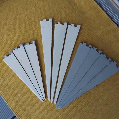 Valkoiset metalliset hyllynkannattimet joihin saa laitettua vaatetangon