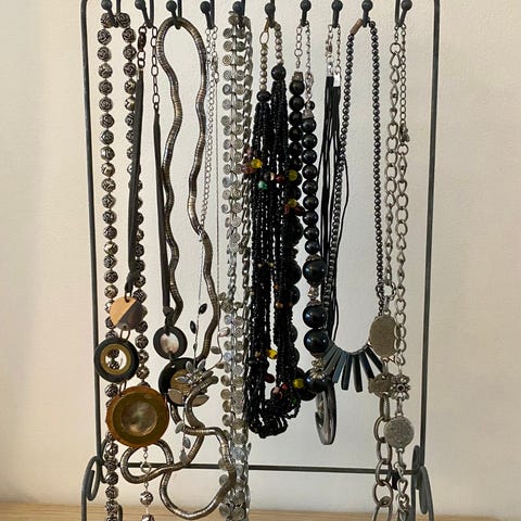Kaunis hopeanvärinen, useammasta kerroksesta koostuva kaulakoru jossa pieniä kirkkaita kiviä. Pituus 44+8 cm lisäpätkä