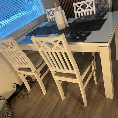 Käsitelty valkoisella vahalla. Kaipaisi vähän hiontaa/uutta vahaa pintaan.